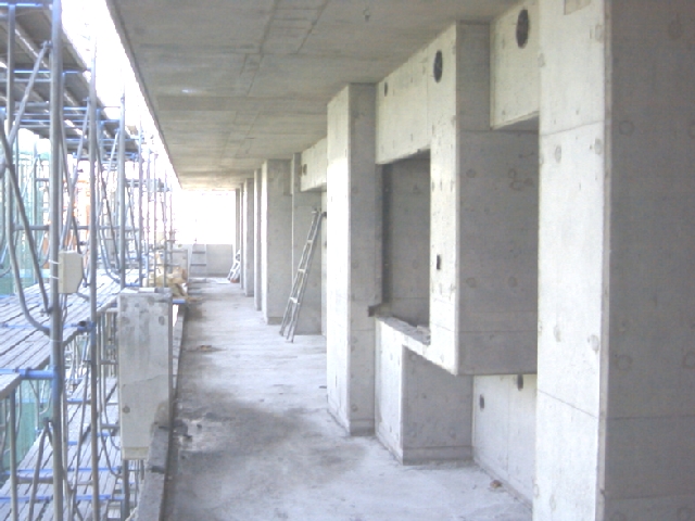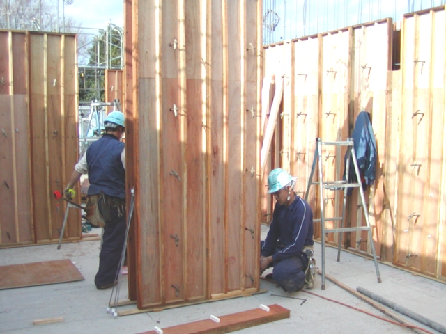 | 組立が完成するとコンクリートの打設を行います。 | コンクリートの固まりを見ながら型枠の解体(脱型)を行います。ここまでの作業を最上階まで繰り返し当社の担当工事が完成します。 | 型枠材の搬出、清掃を行い引き渡しを行います。 |