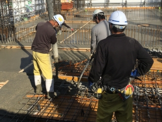 | 組立が完成するとコンクリートの打設を行います。 | コンクリートの固まりを見ながら型枠の解体(脱型)を行います。ここまでの作業を最上階まで繰り返し当社の担当工事が完成します。 | 型枠材の搬出、清掃を行い引き渡しを行います。 |